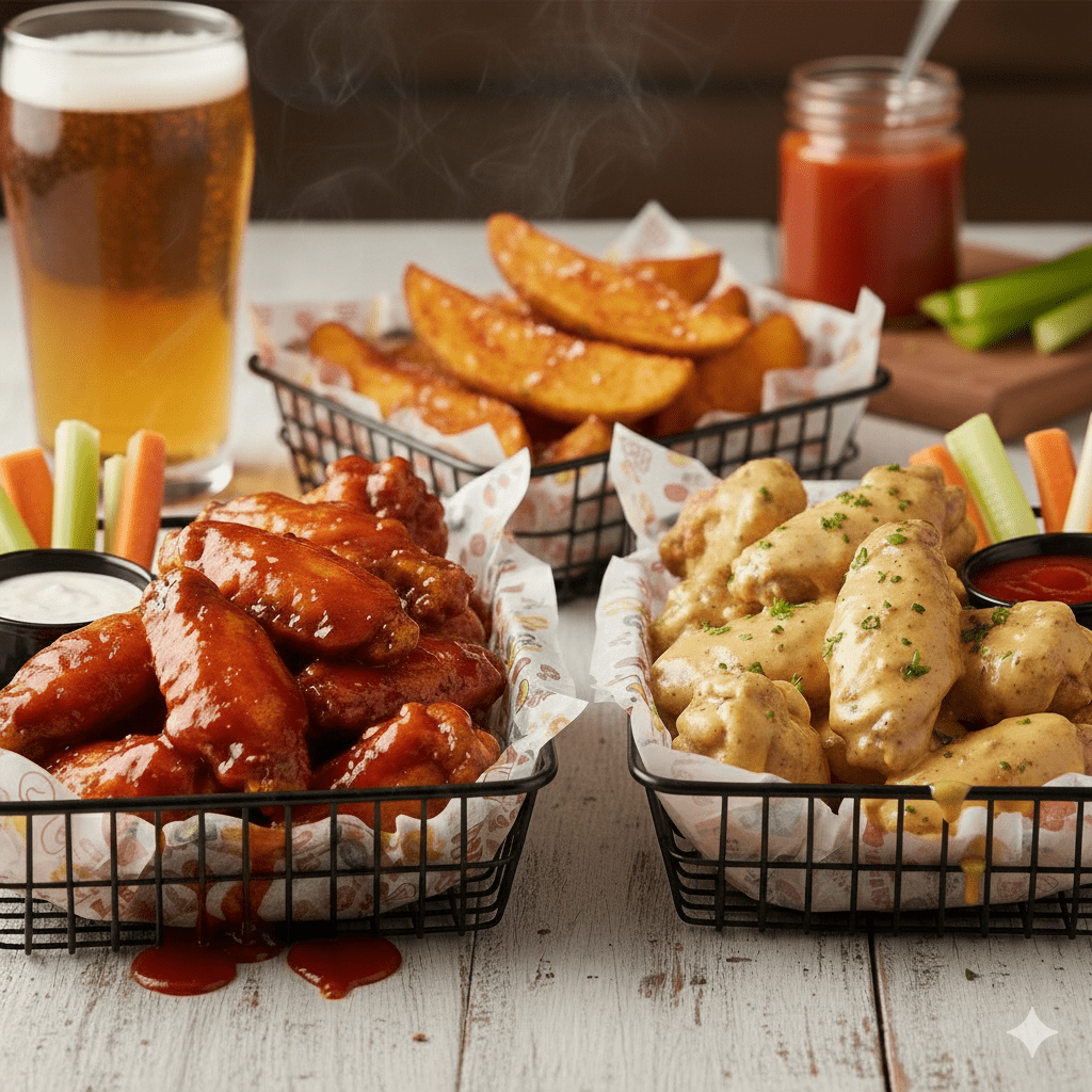 600gr de alitas jugosas y bañadas en nuestra irresistible salsa bbq o miel mostaza acompañadas de papas en casco.